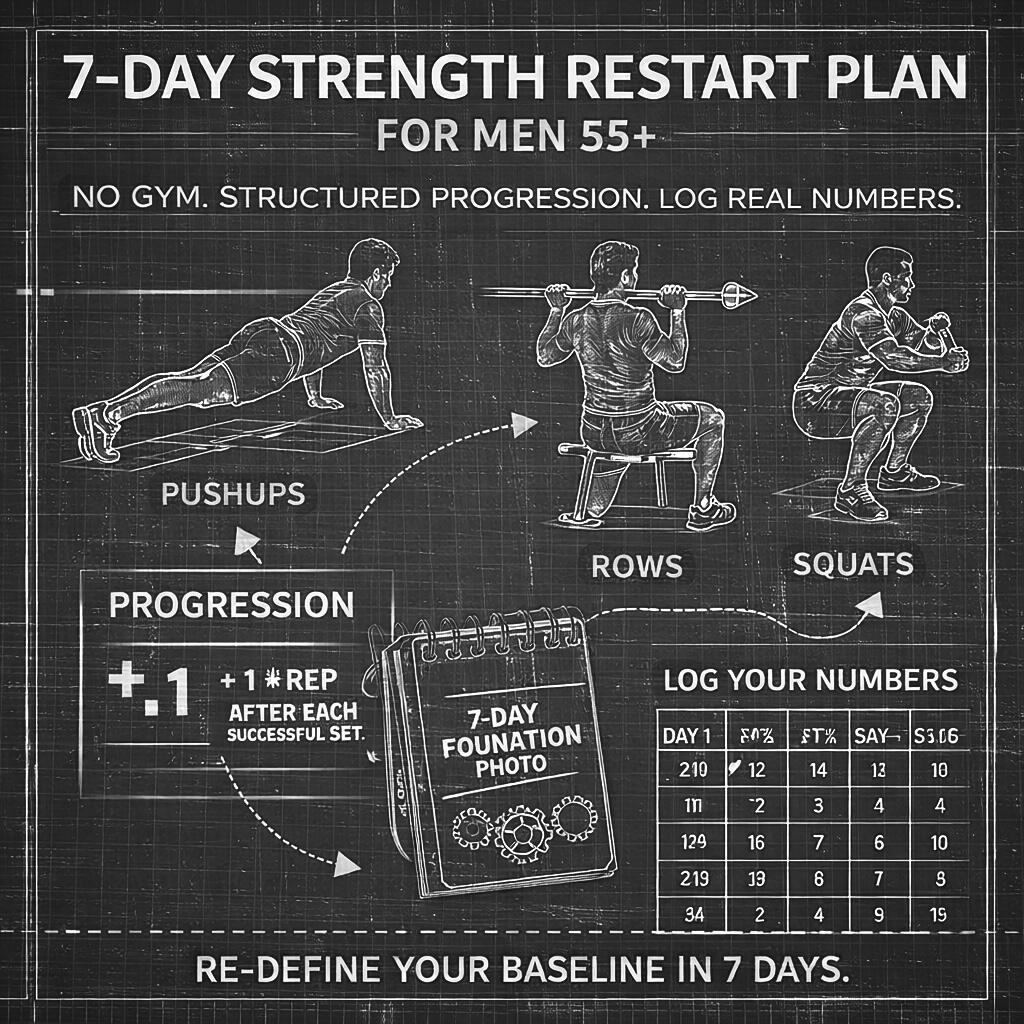 The 7-Day Strength Restart Plan introduces a simple system built around three movements:• Pushups
